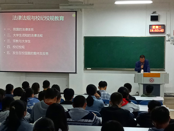 朱吉韬副书记则通过大量例子向同学们详细的介绍了有关法律法规与校纪校规的知识,主要包括了我国的法律体系,大学生须知的法律法规,校纪校规等。