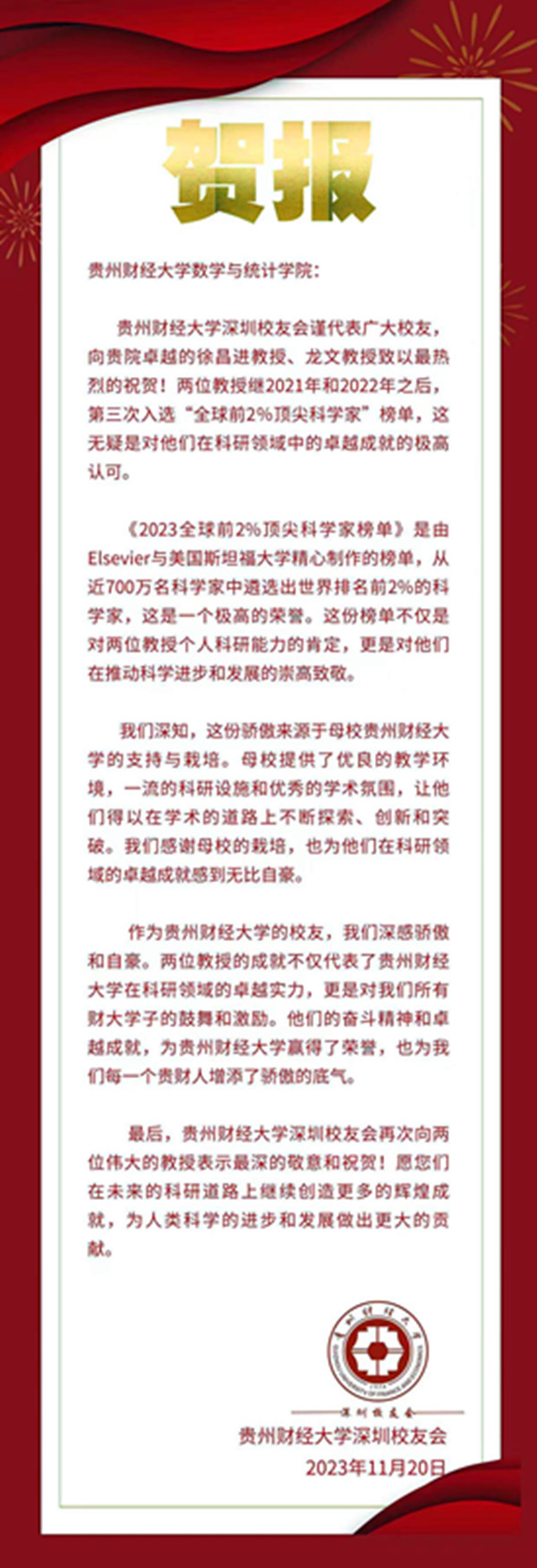 近日,贵州财经大学深圳校友会向皇朝娱乐城 发来贺报,祝贺学院徐昌进教授和龙文教授继2021年、2022年之后第三次入选“全球前2%顶尖科学家”榜单,对学校培养了在科研领域有卓越贡献的杰出校友表示赞扬。