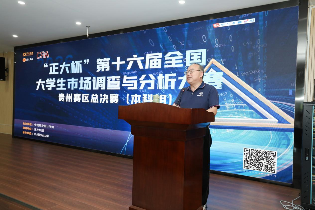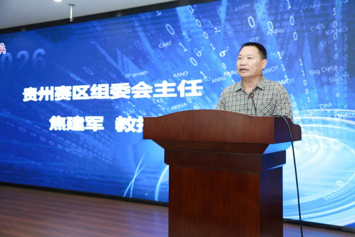 赛区组委会主任、贵州省大数据统计分析重点实验室焦建军教授回顾了此项赛事的发展历程,通报了本届贵州省赛的参赛情况,来自全省25所高校的6925名本科生报名参赛,历经知识赛网考、校实践赛选拔、省选拔赛报告评审等环节的激烈角逐,来自贵州大学、贵州财经大学、贵州商学院、贵州师范学院、贵州理工学院、黔南民族师范学院等6所高校的30支队伍入围本次决赛,共同角逐晋级全国总决赛的名额。他期望所有团队赛出水平、赛出风采!期待本届大赛涌现更多精彩作品。